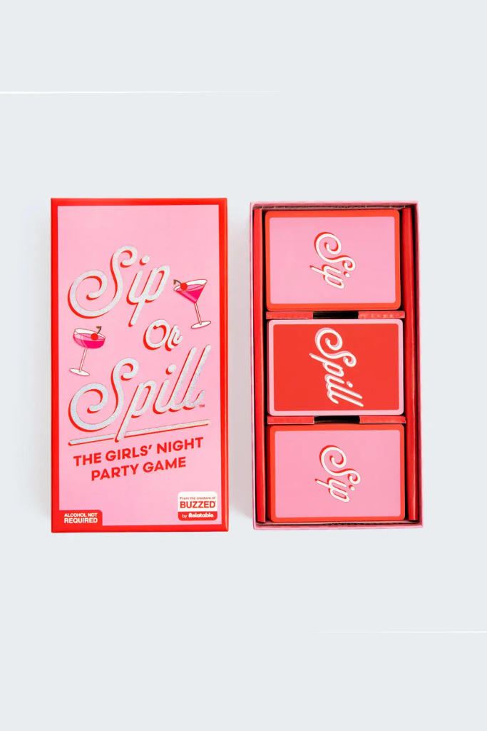 Sip or Spill is the ultimate card game to get the party started with your friends. Draw a Spill card and decide whether to answer the question or pass it on—if you pass, you must draw a Sip card and take a drink. With 300 cards full of fun challenges and dares, this game guarantees laughs and unforgettable moments. Designed for adults 21 and over, Sip or Spill encourages responsible drinking while keeping the energy high. Gather your girls, spill the tea, and sip with style!