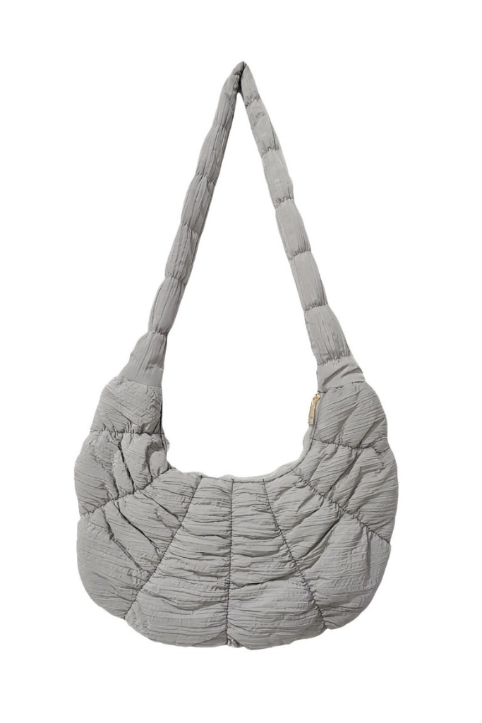 Elevate your everyday style with the Ellis Puffer Crossbody Bag. Its quilted puffer design offers a trendy, cozy look while providing lightweight durability. The croissant shape adds a unique, fashionable touch, making it perfect for hands-free convenience on the go. Ideal for carrying essentials securely, this bag blends comfort and chic effortlessly.