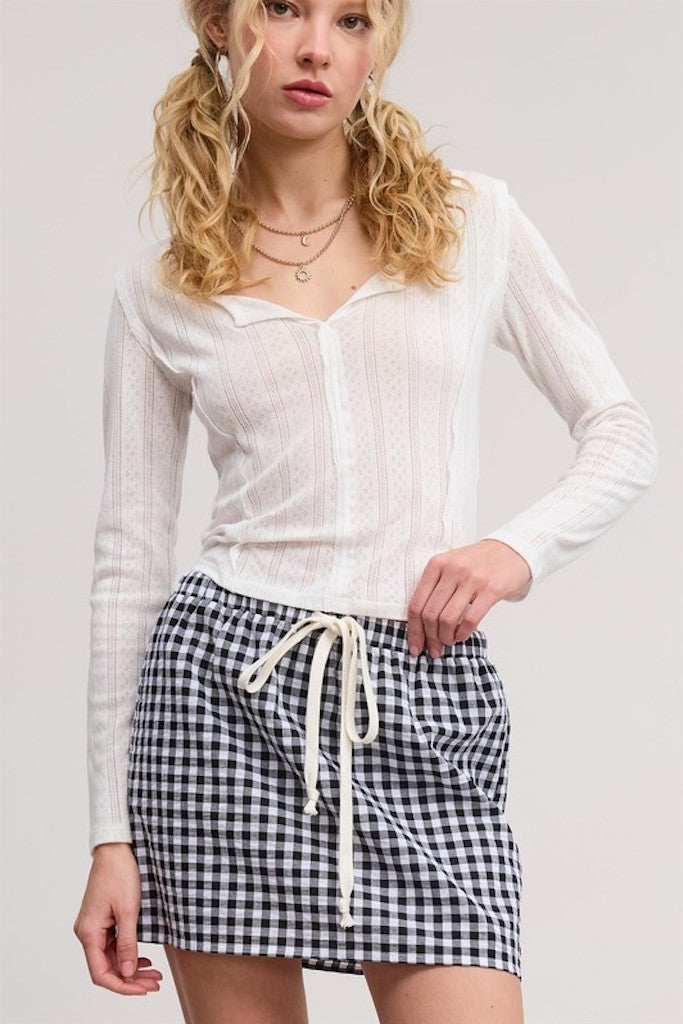 The Zola Gingham Mini Skirt combines classic gingham style with everyday comfort. Its elasticized waistband and front drawstring allow for a customizable fit, while the straight silhouette offers a flattering shape. Made from a breathable blend of 70% polyester and 30% cotton, this unlined skirt keeps you cool and comfortable all day long. Perfect for effortless, chic looks that move with you.
