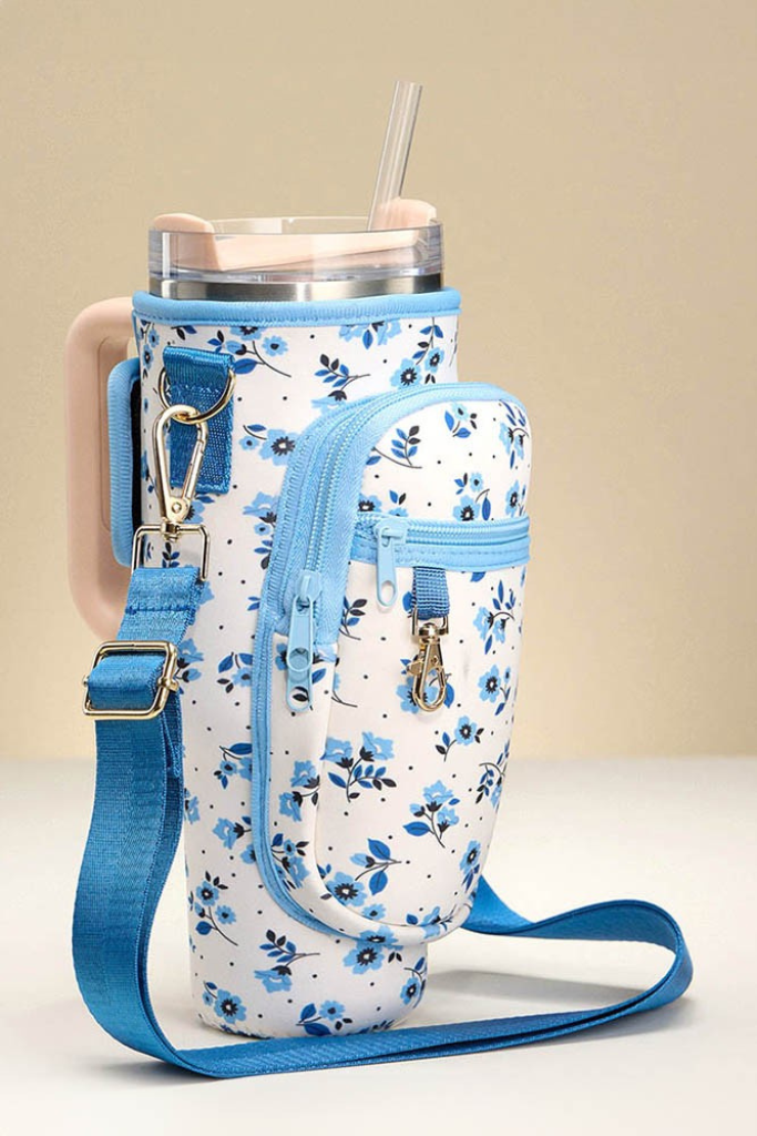 Carry your 40oz Stanley tumbler in style with this Blue Floral Tumbler Carrier. Adjustable and detachable for a perfect fit and easy cleaning, it features two outside zipper pockets to keep your essentials secure and within reach. Durable and convenient, this carrier makes transporting your tumbler effortless and fashionable.