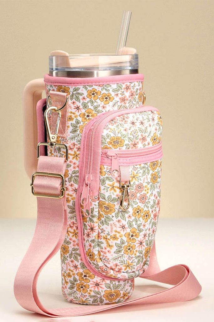 Carry your 40oz Stanley tumbler in style with this Blue Floral Tumbler Carrier. Adjustable and detachable for a perfect fit and easy cleaning, it features two outside zipper pockets to keep your essentials secure and within reach. Durable and convenient, this carrier makes transporting your tumbler effortless and fashionable.