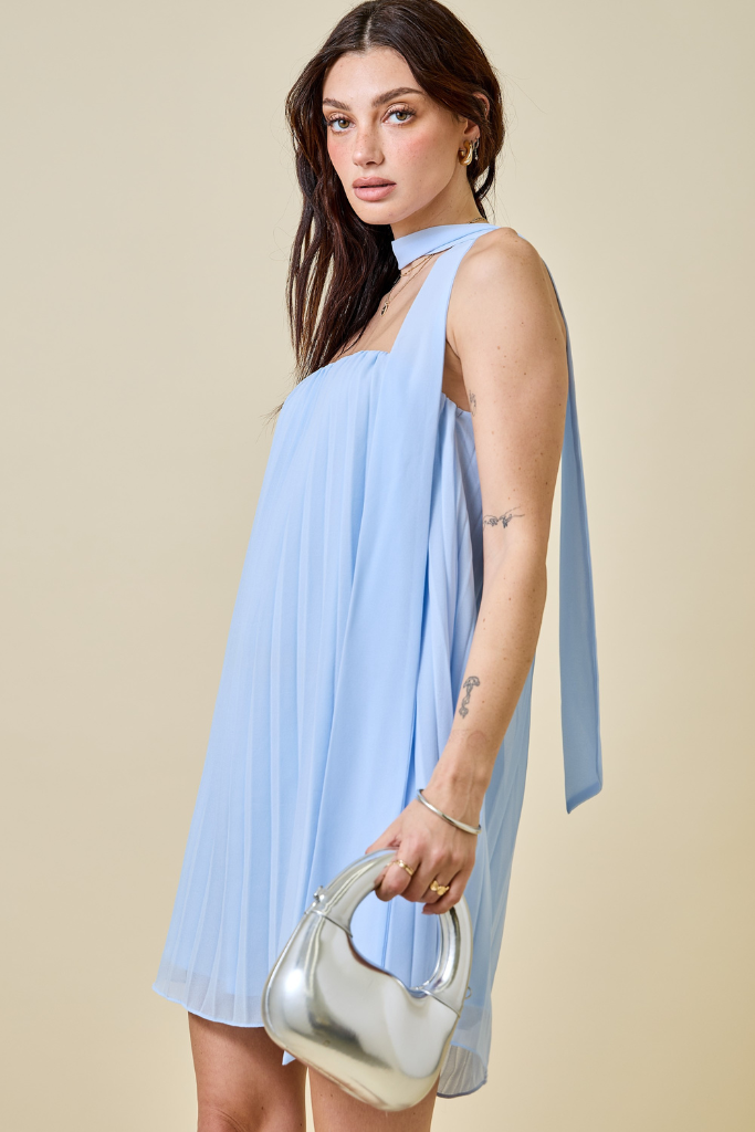Elevate your style with the Nattalie Pleated Dress. This sleeveless mini dress features delicate pleats and adjustable ties at the neck, creating a flattering silhouette that moves gracefully with you. Perfect for day-to-night wear, it combines comfort and elegance effortlessly, making it a must-have for your wardrobe.