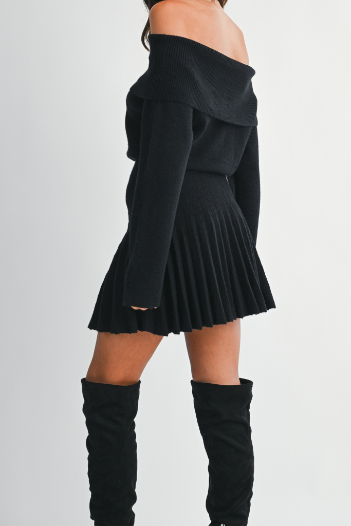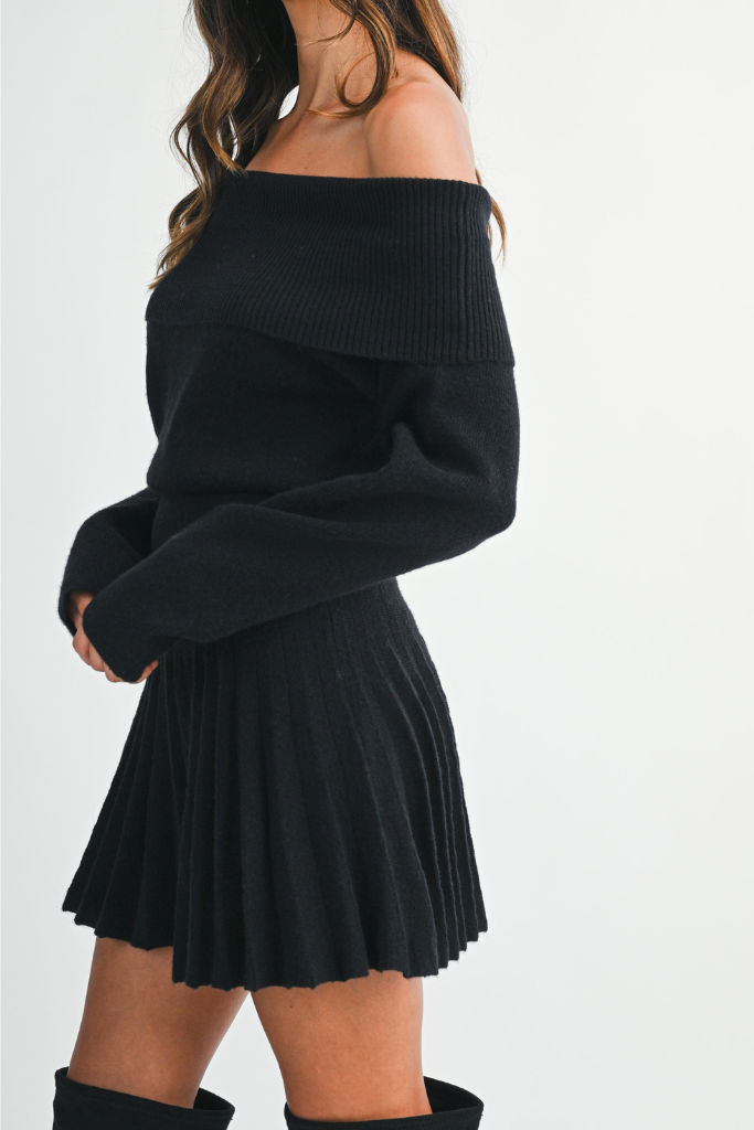 Elevate your style with the Talli Off Shoulder Dress. Crafted from ribbed knit fabric, this dress features a flattering off-shoulder neckline and long sleeves that add a touch of elegance. The fitted waist enhances your silhouette, while the pleated mini skirt brings a playful, feminine finish. Perfect for both casual outings and special occasions, this dress combines comfort and chic sophistication effortlessly.