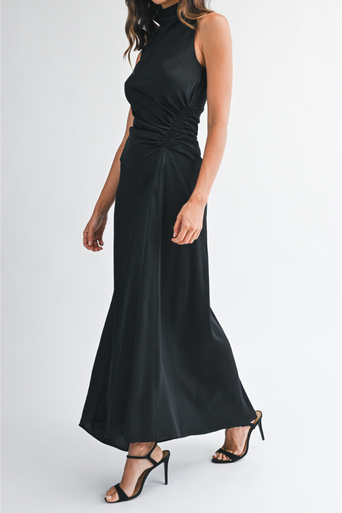 Elevate your evening look with the Aniya Satin Maxi Dress. This sophisticated piece features a luxurious satin fabric with a striking high mock neckline and sleeveless silhouette that exudes modern elegance. The flattering high-low hemline creates dynamic movement, while strategic side waist shirring defines your silhouette beautifully. A discreet back invisible zipper ensures a seamless, polished finish. Perfect for special occasions, cocktail events, or whenever you want to make a refined statement.