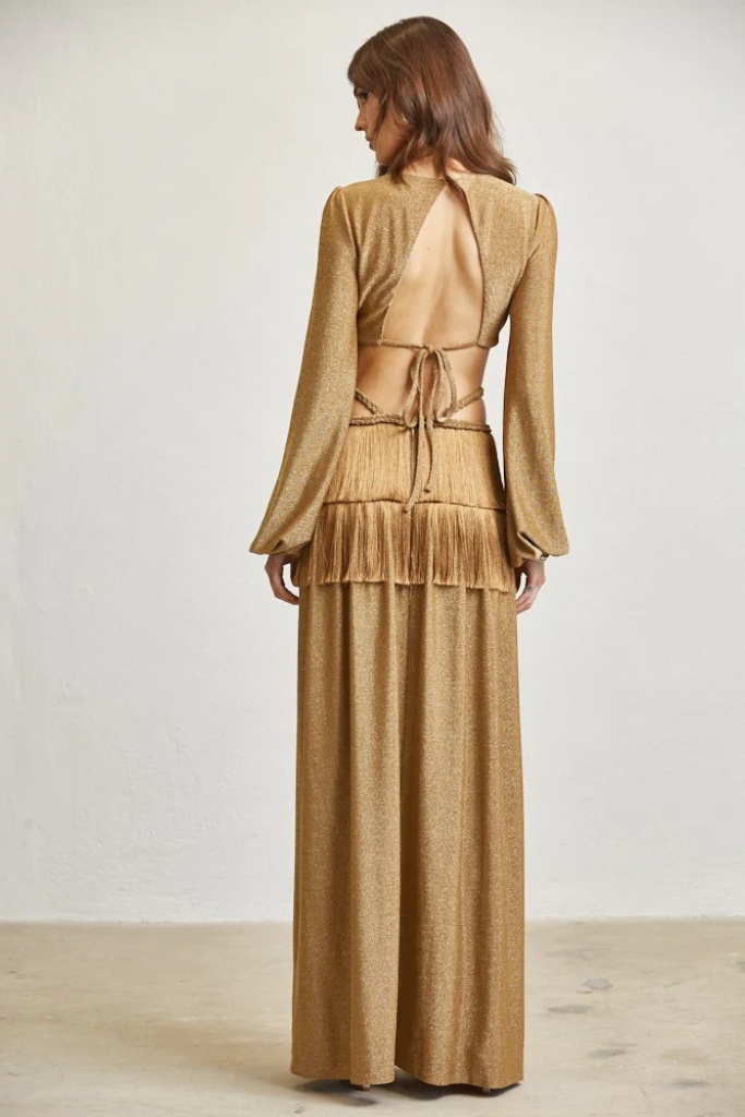 Make a statement in the Edge Of It Metallic Maxi Dress, where bold design meets undeniable glamour. This show-stopping piece features shimmering metallic knit fabric adorned with intricate braided rope trim throughout, creating dimension at every angle. The flattering V-neckline and flowing bishop sleeves offer elegance, while strategic waist and back cutouts reveal just the right amount of skin for an edgy-chic vibe. Double-tiered metallic fringe cascades beautifully, and a back tie detail adds an unexpected touch of sophistication. Finished with a convenient zipper back closure, this maxi dress transforms any occasion into an unforgettable moment.