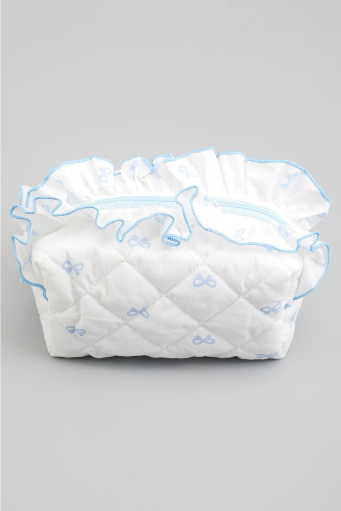 Elevate your beauty routine with the Mackenna Makeup Bag, a quilted essential that combines style with practicality. Adorned with an enchanting bow print and finished with delicate ruffles, this pouch brings a touch of feminine charm to your daily routine. Measuring 7.5" x 4.5" x 5.5", it offers the perfect balance of compact design and generous storage for all your cosmetics and beauty essentials. Whether you're organizing your vanity or packing for travel, this chic accessory keeps everything you need within arm's reach while making a statement.